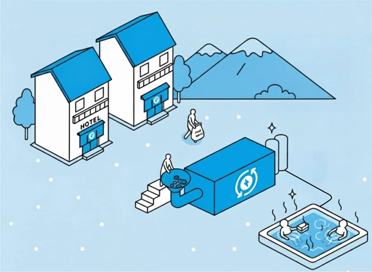 ホテルや旅館に本技術を導入し、その場で処理・エネルギー化することで、館内照明や給湯に活用し、“ごみから価値を生むサステナブルな宿泊体験”を提供することが可能になります。例えば温泉街であれば、廃棄物由来エネルギーを浴場の加温や暖房に活用することもできます。
